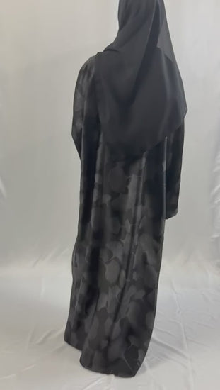 The Noor Al Haya Abaya is a refined expression of modest elegance. Designed in a soft black tone, this open abaya features delicate metallic floral patterns that create a subtle shimmer, adding depth and sophistication without overpowering the design.