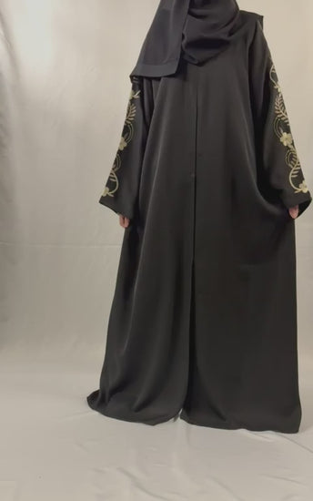 The Yasmin Noor Abaya is a graceful expression of elegance and femininity. Designed in classic black, this open abaya features delicate floral embroidery along the sleeves, inspired by the soft beauty of jasmine flowers illuminated by light.